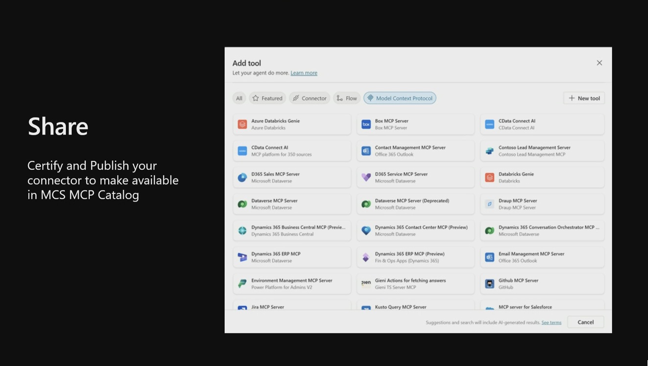 設定・最適化したMCPサーバーは、組織内で「コネクタ」としてカタログに公開・共有できます。 公開されたコネクタはCopilot Studio内のカタログに並び、他のエージェント作成者は選ぶだけですぐに利用可能です。
