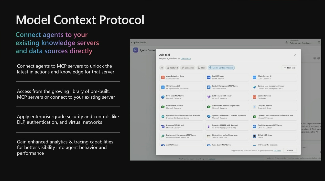 これまでのAI開発では、システムごとに個別の「ブリッジ」を作成する必要がありました。今回のセッションでは、オープン標準である MCP (Model Context Protocol) をフルサポートすることで、Copilot Studioが「あらゆるツールやエージェントがつながるハブ」へと進化したことが発表されています。