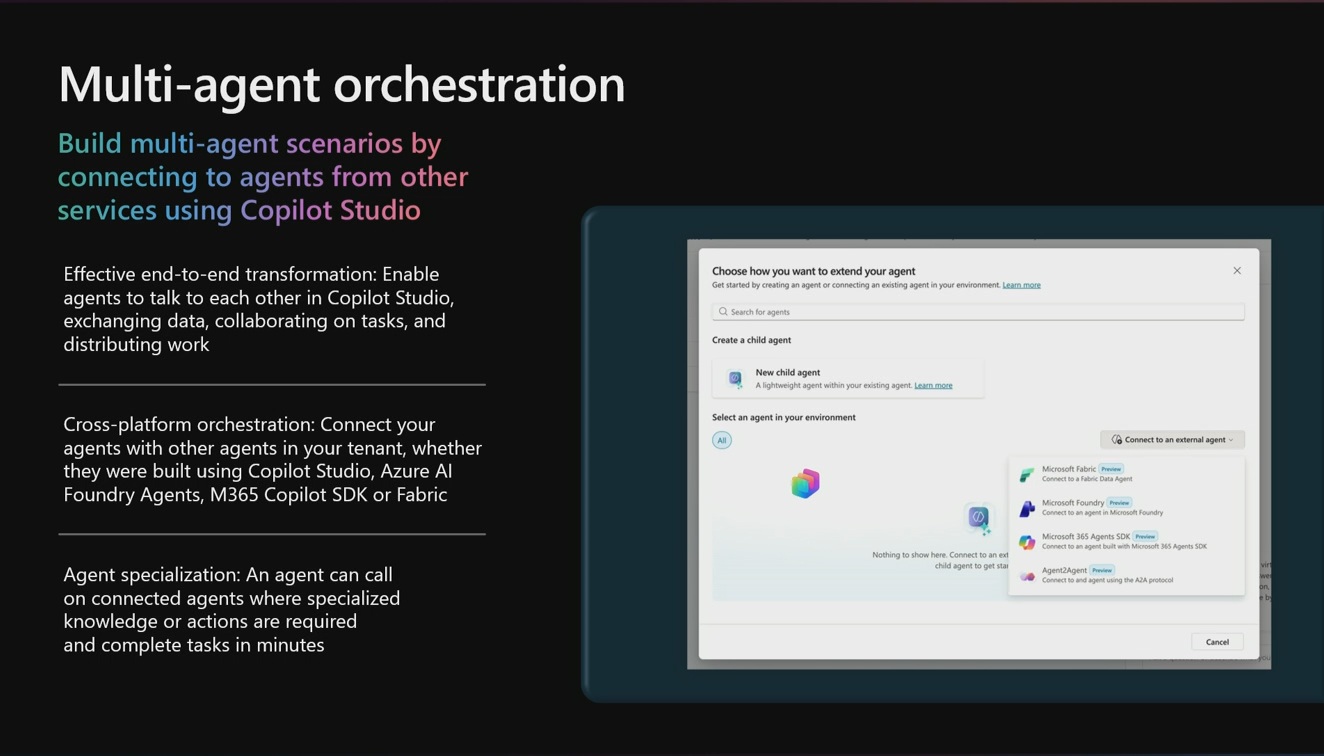 単に「Copilot Studio内でエージェントを作る」だけでなく、異なるプラットフォームで作られたエージェントを、Copilot Studio上で統合・管理できる「マルチエージェント・オーケストレーション」機能が強化されました。
