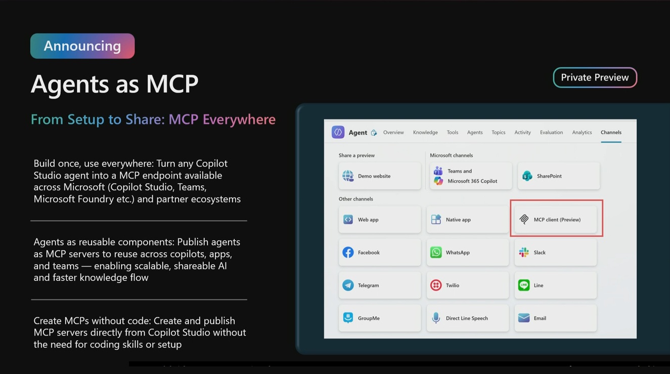 セッションの最後に発表されたのが、「Copilot Studioのエージェント自体をMCPエンドポイントとして公開する」機能です。