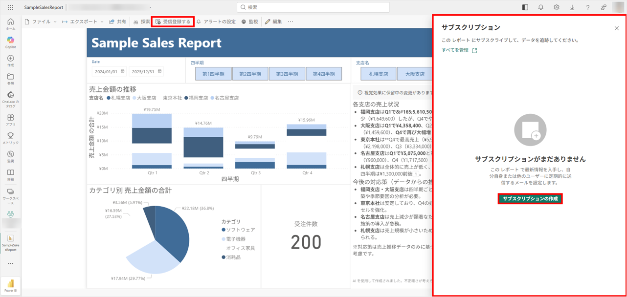 1. Power BIサービス上でレポートを開き、画面上部の「受信登録する」から「サブスクリプション」作成画面を開く。