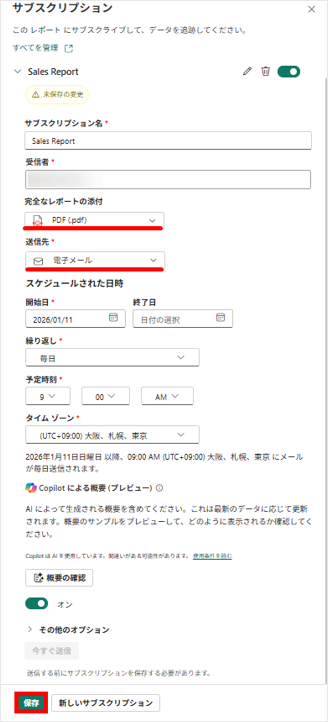 3.受信者やレポート添付の有無、送信方法、スケジュール設定などを設定し、サブスクリプションを保存する。