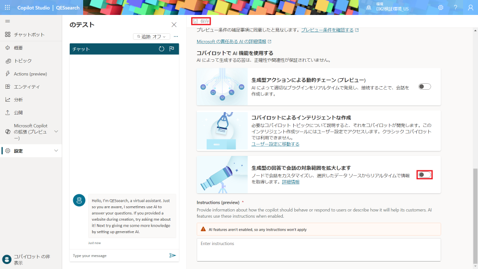 ③コパイロットが作成されたら、下の方にスクロールして、「生成型の回答で会話の対象範囲を拡大します」のスイッチを有効化して、 保存 ボタンをクリックします