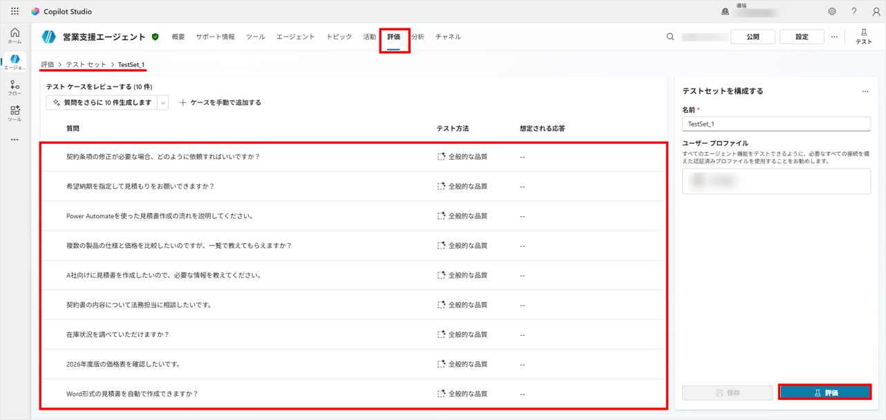 「質問」と「期待される回答」のテストセットを作成することで、プロンプトやデータを変更した際に精度が下がっていないかを即座に検知できます。