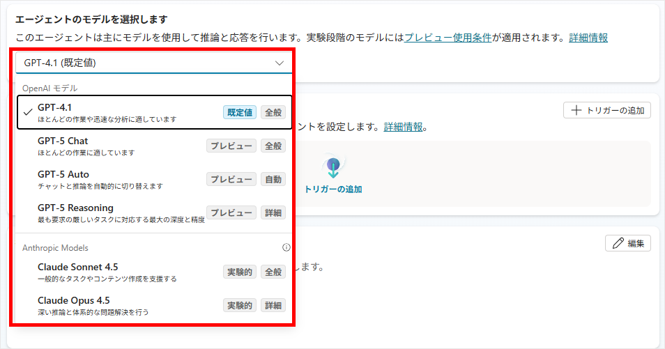 2026年1月現在、Copilot Studioでは GPT-5 および GPT-4.1 が標準モデルとして利用可能です。