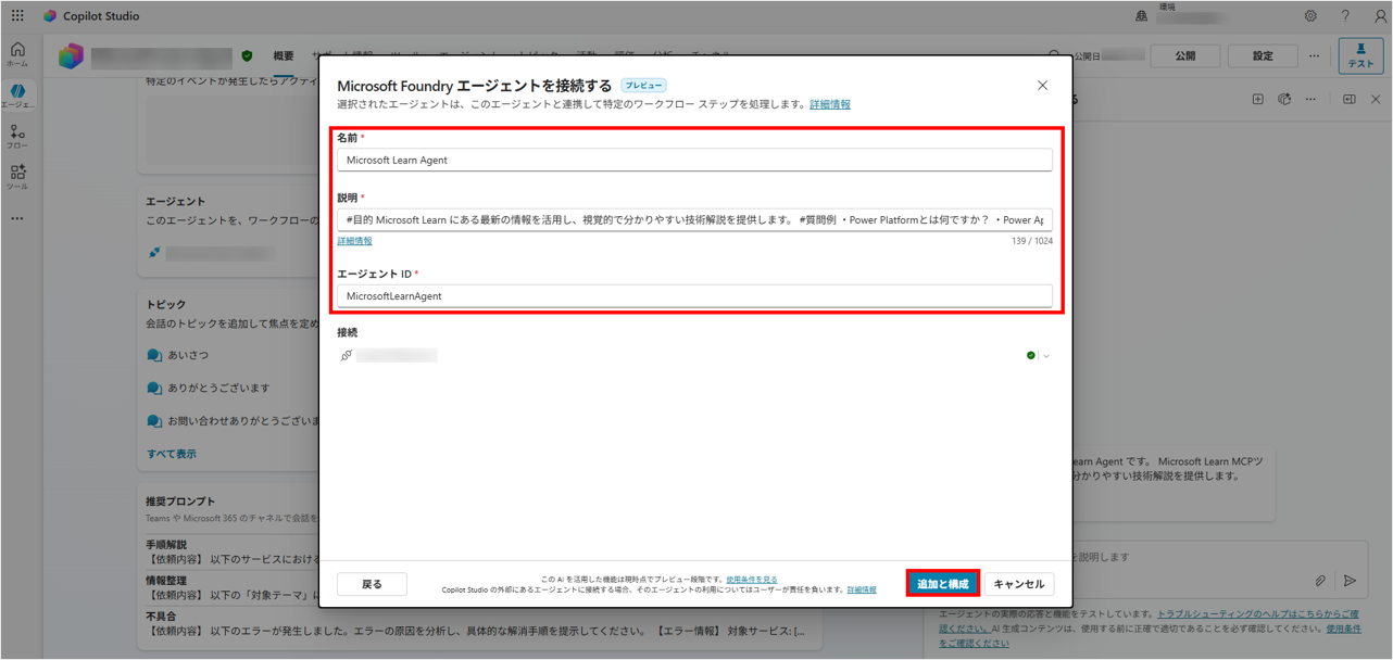 Microsoft Foundry 側で作成済みの エージェント ID(Microsoft Foundryで作成したエージェントの名前) を入力し、