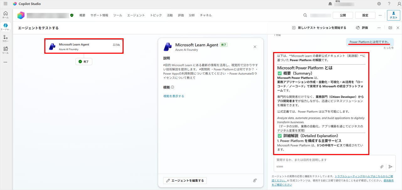 「Power Platformとは何ですか。」と質問したところ無事にエージェントが呼び出され返答が返ってきました。