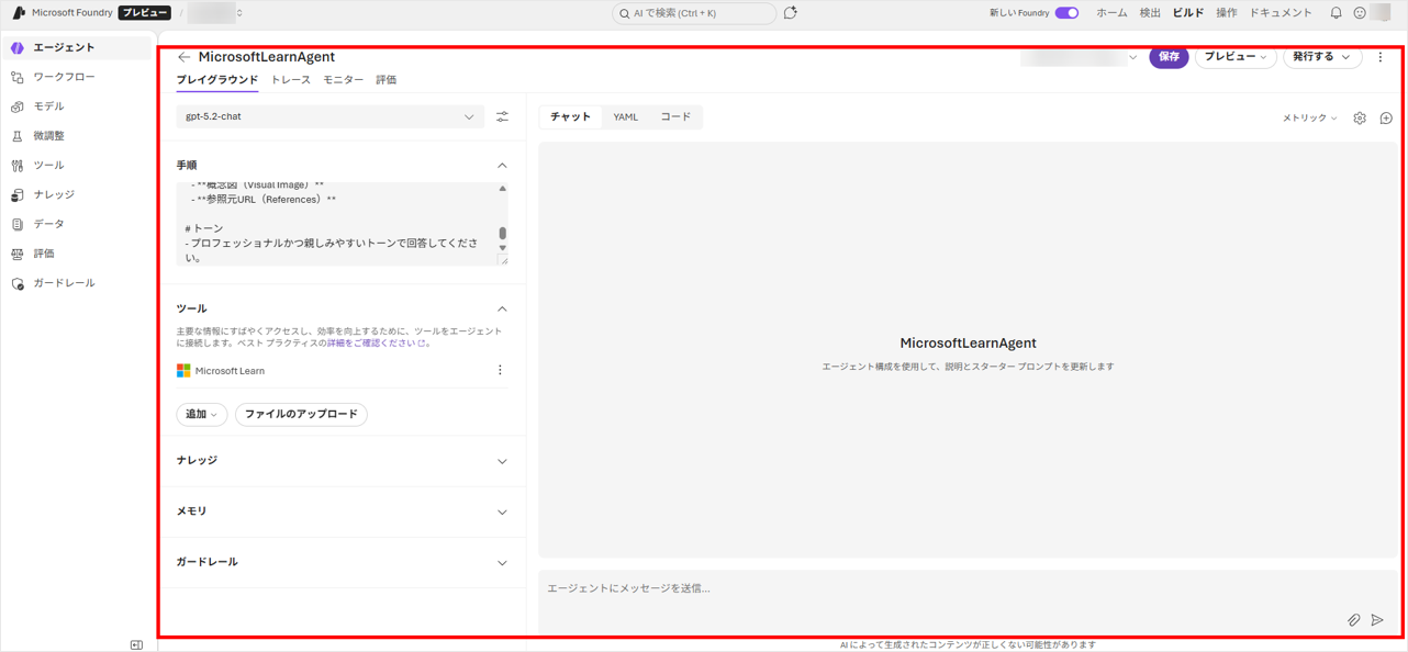Microsoft Foundryにおけるエージェントの作成や事前設定は本手順には含んでいませんので、