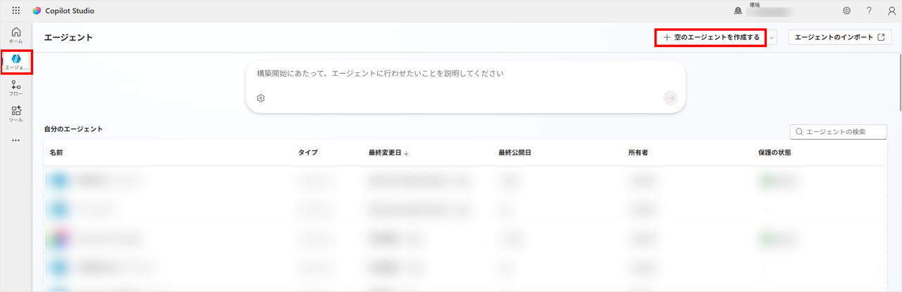 まずは Copilot Studio にサインインし、エージェントを作成します。