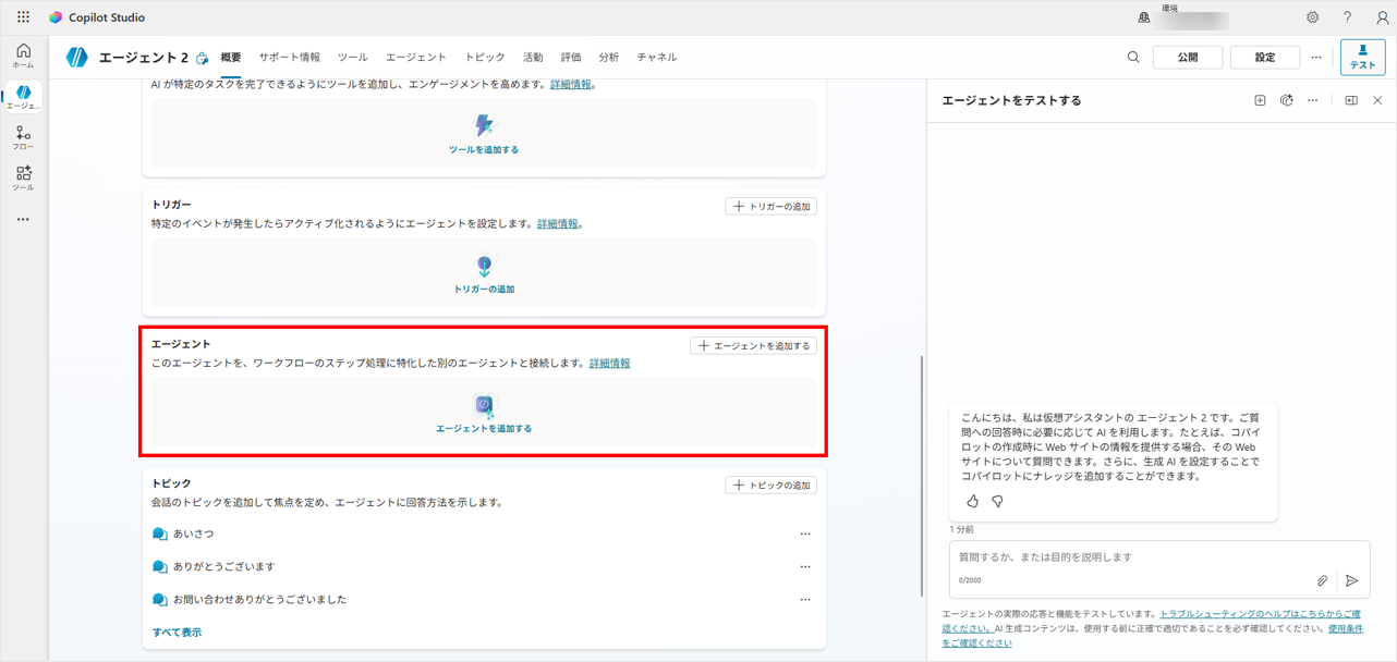 設定を保存したら、Copilot Studio上のチャット欄でテストを行います。