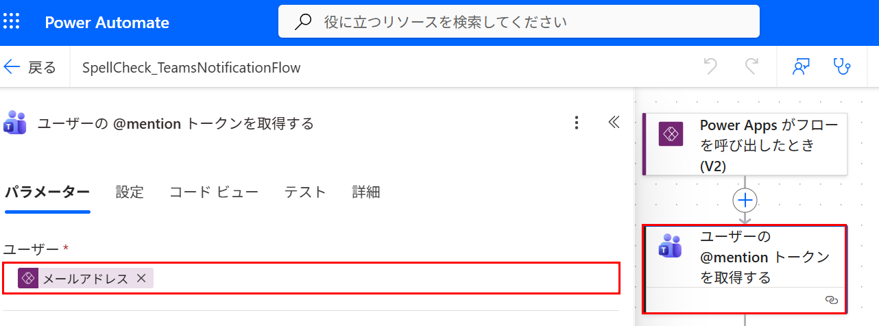 [ユーザー]には [Power Apps がフローを呼び出したとき (V2)]トリガーから取得した[ メールアドレス] を設定します。