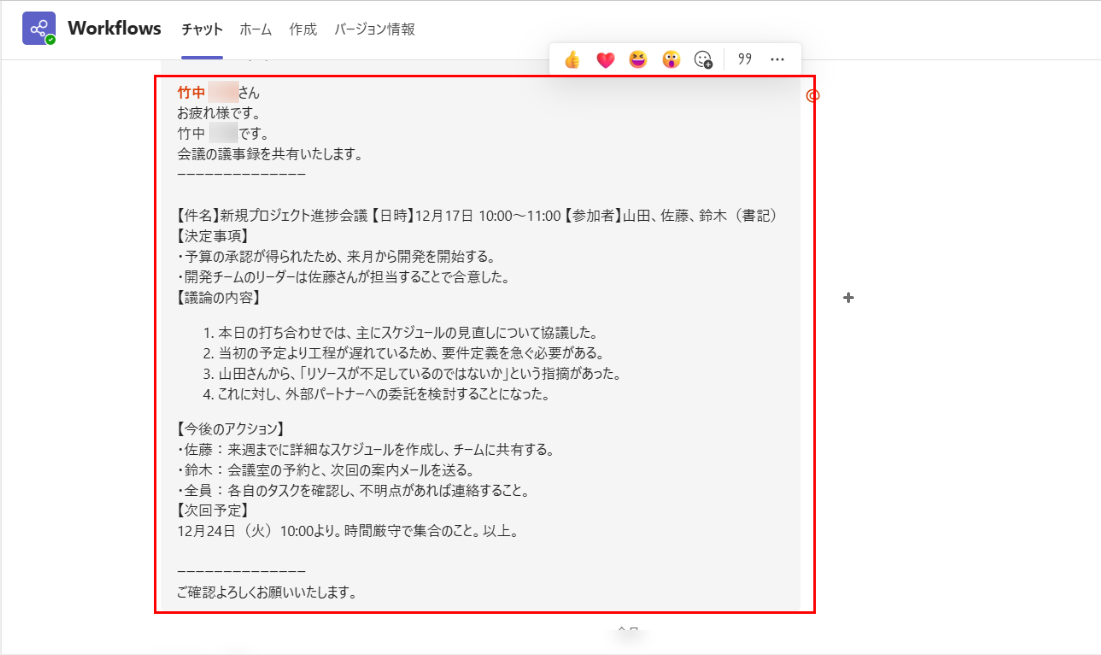 | フロー ボット | ・システム ([Workflows])からの自動通知として表示される ・個人のアカウントとは切り離されているため、誰が見ても「自動投稿だ」と分かる |