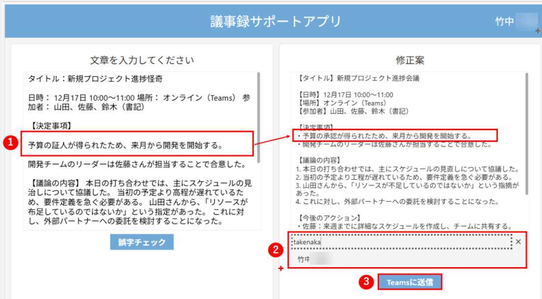 - Teams投稿機能:ボタンをクリックすると校正された文章がTeamsに投稿される機能(投稿される仕組みは次章に記載)