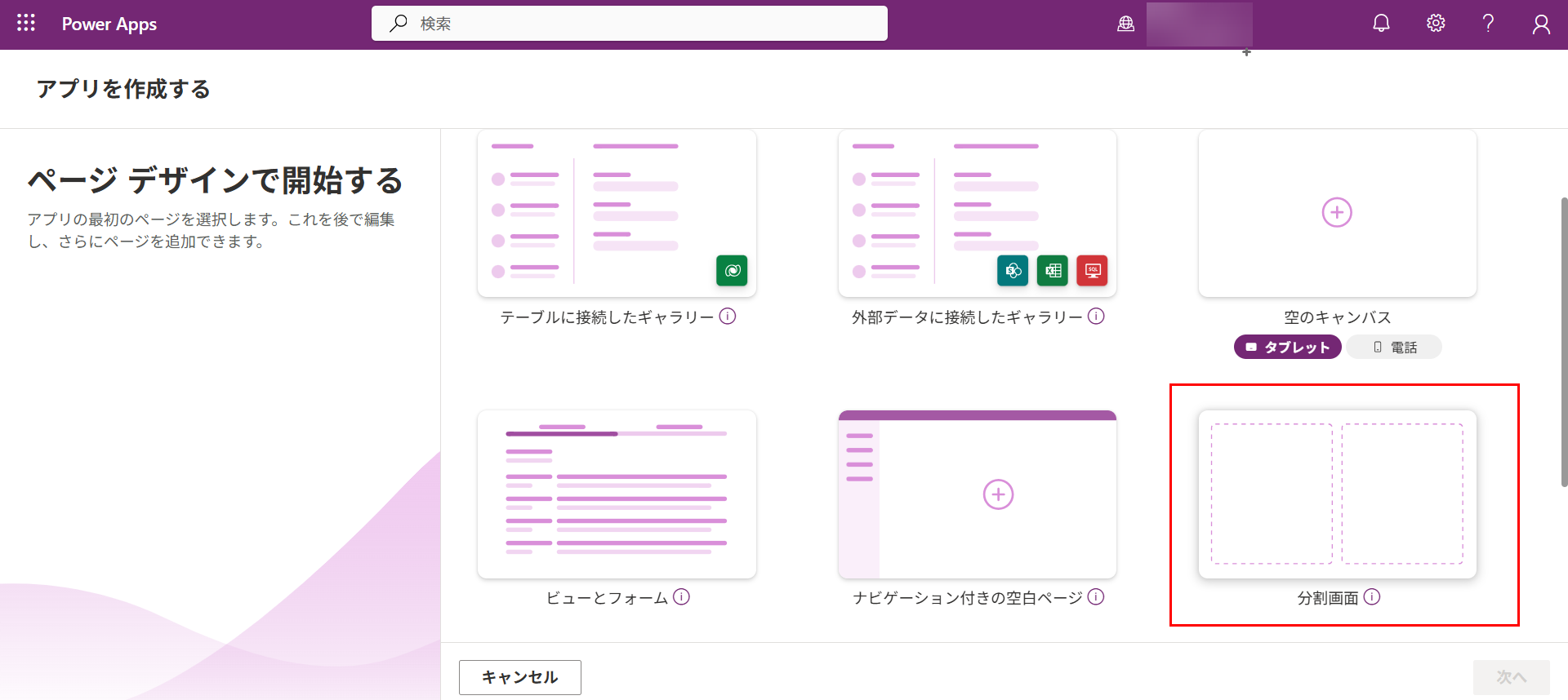 「ページデザインで開始する」はキャンバスアプリのテンプレートのようなものです。 レイアウトのイメージがある程度決まっている、かつイメージに合致するものがあれば「ページデザインで開始する」を使用するとより簡単にアプリを作成できます。