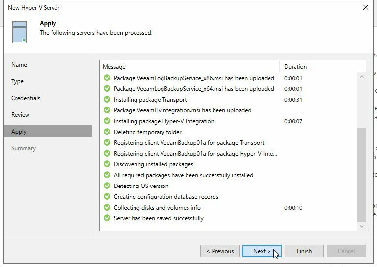 Apply画面にて、Hyper-Vホストに対してVeeamのモジュールがインストールされるので、「Next」をクリックします。