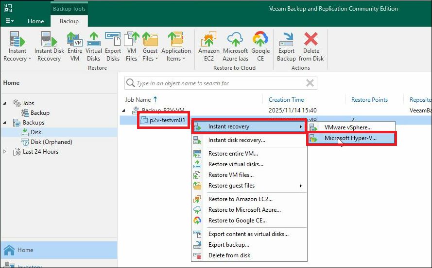 右クリック→メニューより、「Instant recovery」→「Microsoft Hyper-V」を選択します。