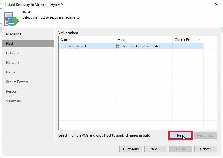 Host画面にて、リストア先のHyper-Vホストを選択するために、「Host」をクリックします。