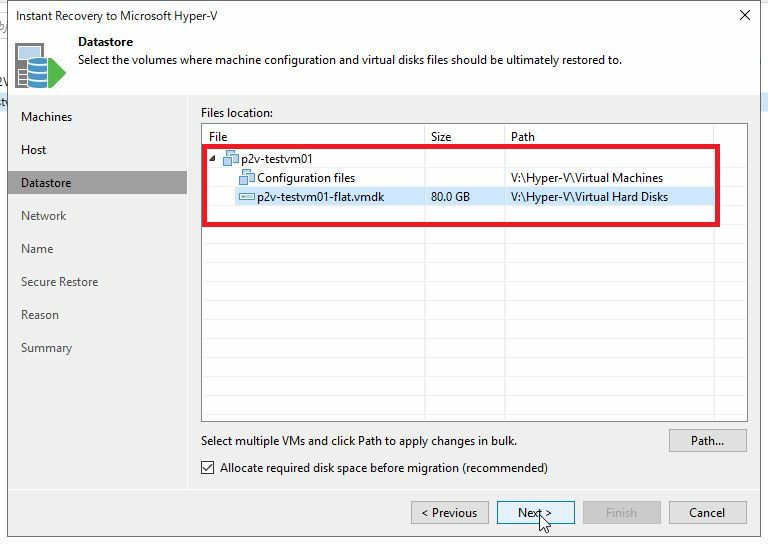 リストア先Hyper-Vのデフォルト設定が適用されますが、個別に変更を行いたい場合は「Path」ボタンから変更可能です。