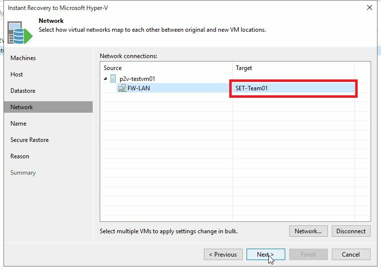 Network画面にて、リストア先Hyper-Vホストで利用する仮想NICを設定します。「Network」をクリックします。