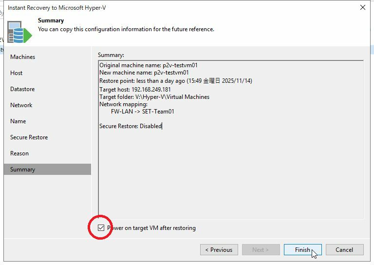 Summary画面にて「Finish」をクリックします。仮想マシンのリストアが開始されます。