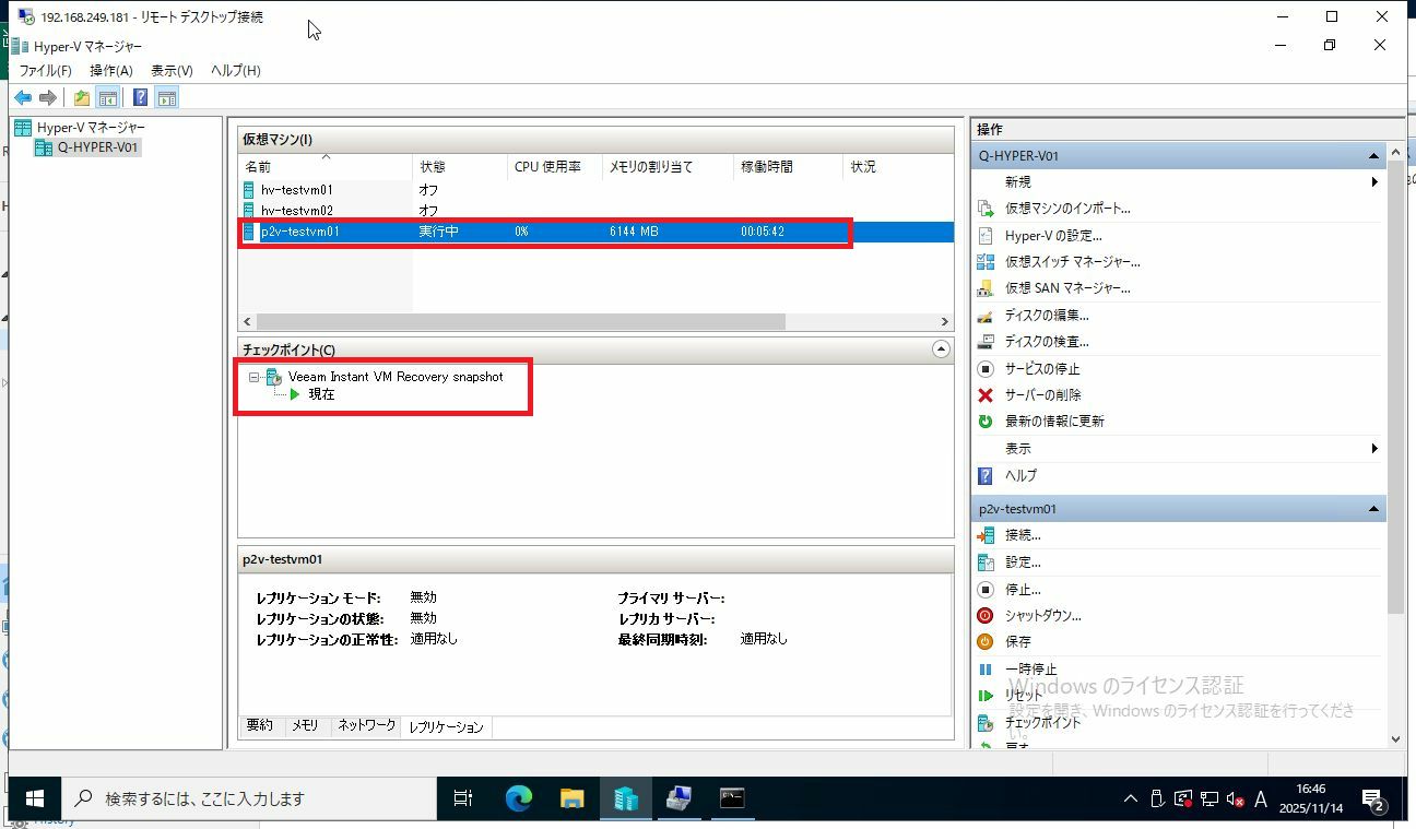 移行先Hyper-VホストのHyper-Vマネージャーにて、リストアした仮想マシンが登録され、起動されている事を確認します。