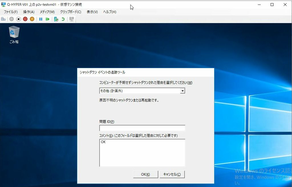 画面はオンラインでバックアップ取得した仮想マシンをリストアしているため、シャットダウンイベントの追跡が出ていますが、正常起動しています。