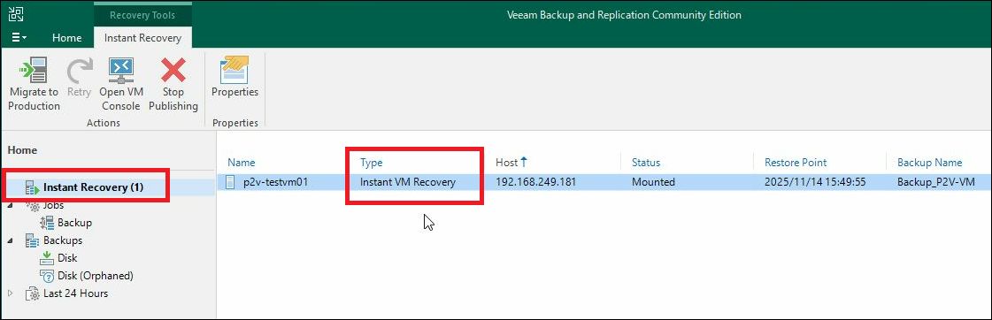 リストアした仮想マシンが「Instant VM Recovery」である事を確認します。