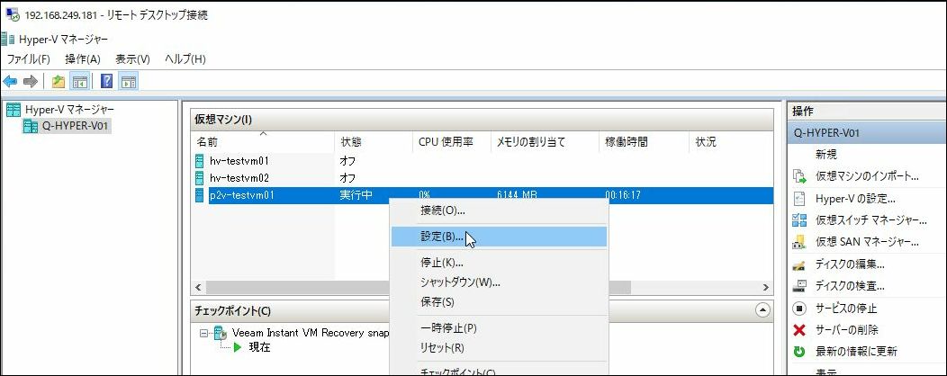 Hyper-Vマネージャーにて、リストアした仮想マシンを選択し、右クリック→「設定」をクリックします。