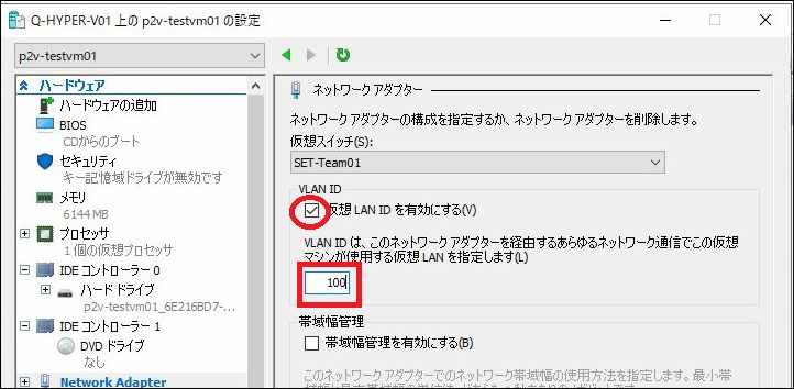 仮想マシンの設定画面にて、Network Adapterの設定を変更します。 (本例ではHyper-V側でタグVLAN有効な仮想NICを使っているため、VLAN設定を追加)