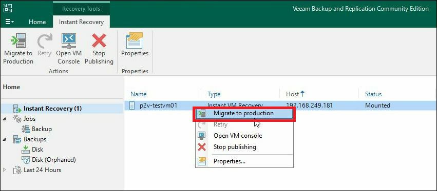 最終処理を行うInstant VM Recoveryを選択し、右クリック→「Migrate to Production」をクリックします。