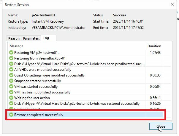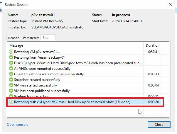 Instant VM Recoveryは、バックアップファイルを直接マウントして仮想マシンを即時起動し、数分で業務を再開できる高速復旧機能です。Hyper-Vホストへのリストアには、このInstant VM Recoveryを利用しているため、この段階では仮想マシンの実体ファイルは、またVeeamバックアップサーバ上のファイルになります。最終処理として、Migrate to Productionを実行し、バックグラウンドで本番ストレージへデータをコピーし直すことで、実運用に適した状態へ移行を完了します。