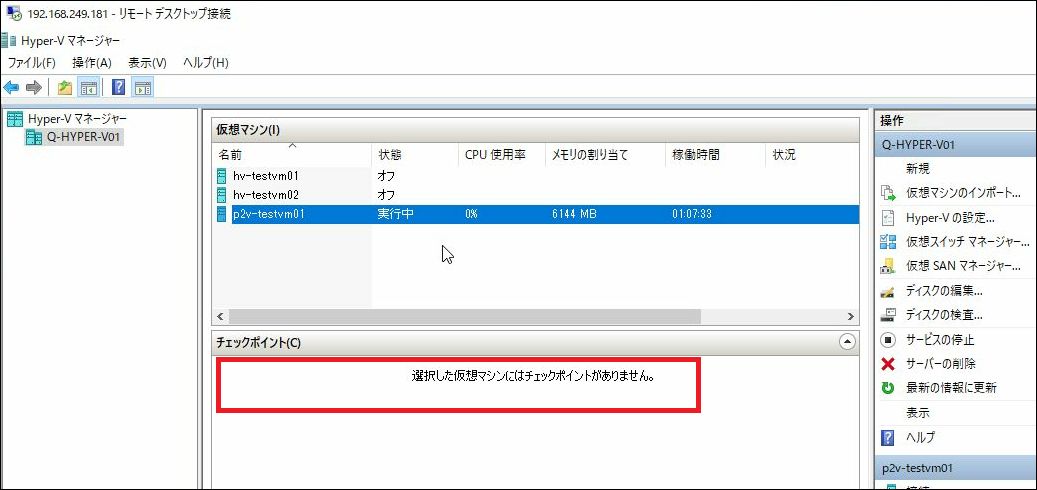 リストア最終処理が完了すると、Hyper-Vマネージャーにて、Instant VM Recovery時に存在したチェックポイントが削除された事が確認出来ます。