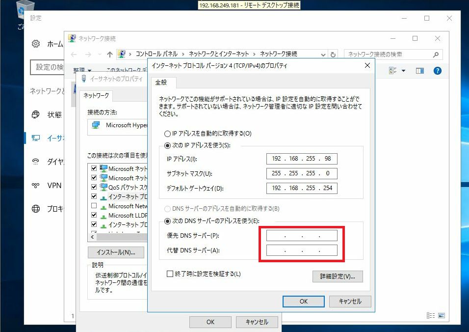その他、元のVMware vSphere仮想マシン内で設定していたDNS設定がクリアされてしまっていたため、再設定を実施。