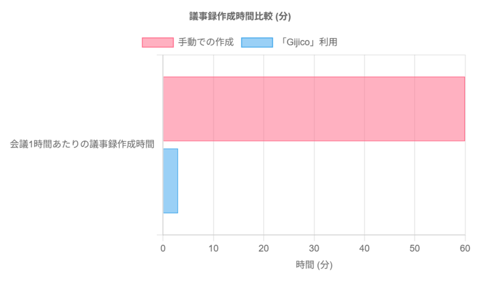 これまで議事録作成にかけていた膨大な時間を、企画立案や顧客対応など、本来注力すべき業務に充てることができます。右のグラフは手動での作業時間と「Gijico」利用時の比較です。