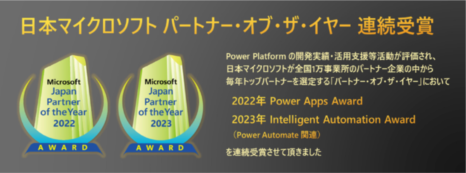 QESは長きにわたりMicrosoft製品・Power Platformを活用したインテグレーション・開発に携わり、その実績と専門知識がソリューションパートナーに認定・スペシャリスト認定を取得しています。また、Power Platformでの開発支援においては日本マイクロソフト社とは異業種での協力や教育プログラムでの登壇など、様々な面で深く協業を進めています。その取り組みが評価され、2022年度・2023年度連続で関連分野において「パートナー・オブ・ザ・イヤー」を受賞しました。